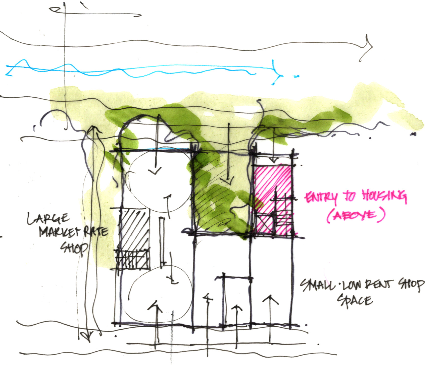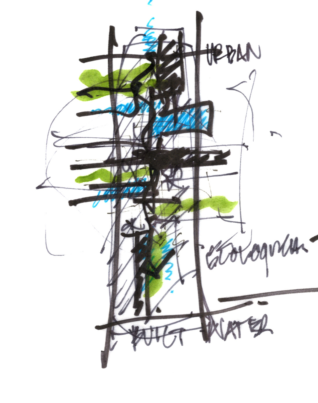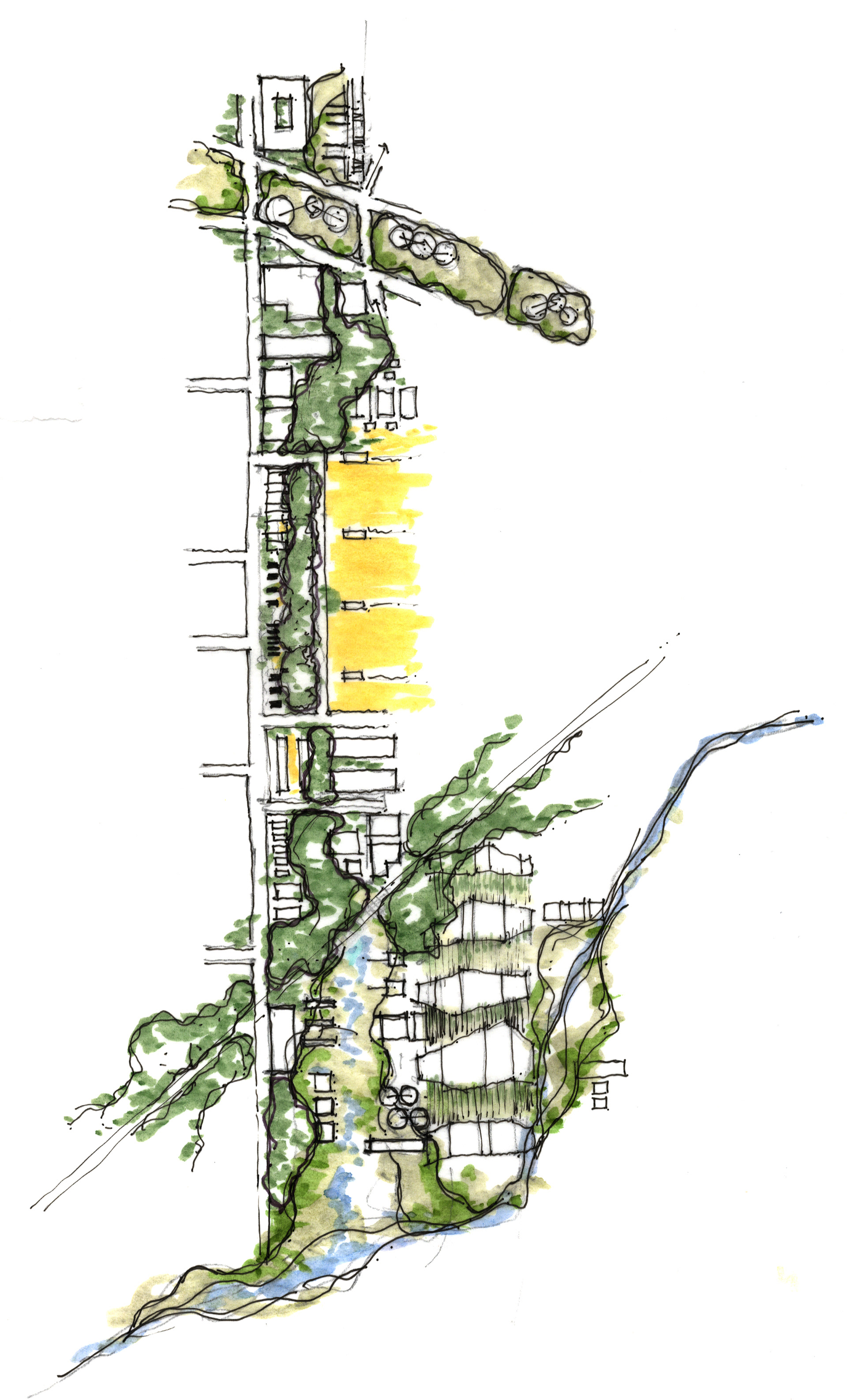 The Lents EcoDistrict evolved out of a multiscalar approach to design and concept. The complex processes of ecology and habitat, water, energy, food, and building materials are integrated in the built and landscape form. District-scale relationships of zoning, ecological function, and stormwater retention and distribution were explored in masterplan while links between the built structures, humans, animals, water, and plants were explored at the human scale.
